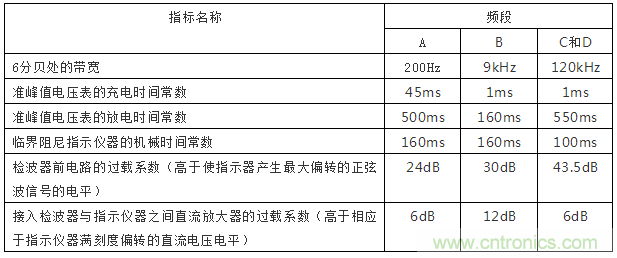 綜上所述,騷擾測量儀必須具有統(tǒng)一的中頻帶寬、檢波器充放電時間常數(shù)、電表機械時間常數(shù)和過載系數(shù),這樣才能保證在測量同一脈沖信號時得到一致的結(jié)果。表2為GB/T6113.1規(guī)定的騷擾測量儀指標(biāo)。其中各頻率段的范圍為: