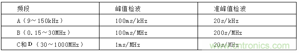 在準(zhǔn)峰值測量時,如想要在某個頻率點得到較穩(wěn)定的測量值,則測量時間應(yīng)大于檢波器充放電時間和電表機械時間常數(shù)之和,并且測量不止一個周期,所以一般準(zhǔn)峰值測量時間要求比較長。如果測量儀具有掃頻測量功能,則設(shè)置的掃描時間應(yīng)符合表9的規(guī)定。在實際測量中,往往先用峰值進行全頻段測量,然后再對超過限值的頻率點進行峰值測量,這樣可以大大節(jié)省測量時間。