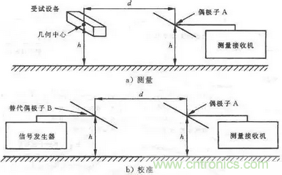 測試距離d雖然沒有明確要求,但最好還應(yīng)符合遠場條件。d的起始點為EUT的幾何中心,終止點為測量天線A的天線中心。替代試驗和校準(zhǔn)試驗時,替代天線B應(yīng)置于EUT 的幾何中心。