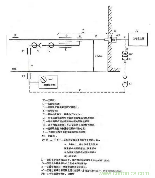 電纜上產(chǎn)生的共模電流,以免影響測量結(jié)果。測量布置如圖19(b)所示,測試應(yīng)在屏蔽室內(nèi)進(jìn)行,電源線長度應(yīng)大于6m,即大于30MHz的半波長加上吸收鉗的長度。對于每一個(gè)測試頻率點(diǎn),吸收鉗都應(yīng)沿著電源線移動(dòng),找出最大值,因?yàn)楣材k娏髟趯?dǎo)線上是以駐波形式出現(xiàn)的。功率吸收鉗測量系統(tǒng)應(yīng)事前進(jìn)行校準(zhǔn),得到修正因子—頻率曲線。校準(zhǔn)布置如圖20所示。