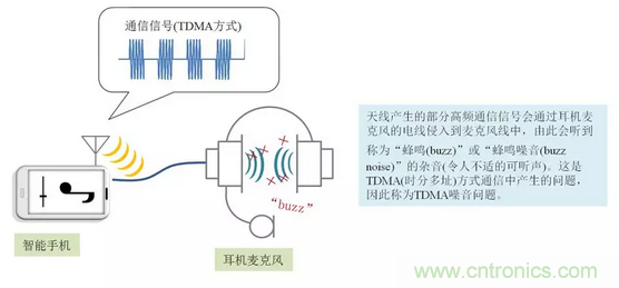 通信電波的高頻信號侵入到麥克風(fēng)線中時,揚聲器會發(fā)出稱為"蜂鳴(buzz)"或"蜂鳴噪音(buzz noise)"的雜音(令人不適的可聽聲)。由于以前在TDMA(時分多址)方式的電話中出現(xiàn)過重大問題,因此普遍稱為TDMA噪音。圖1所示為在智能手機中連接耳機麥克風(fēng)時產(chǎn)生TDMA噪音事例的示意圖。進(jìn)行蜂窩通信時,高頻信號侵入到麥克風(fēng)線中導(dǎo)致產(chǎn)生TDMA噪音。