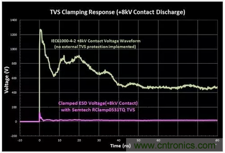 TVS Clamping Response ( 8kV Contact Discharge): TVS鉗位響應(yīng)( 8kV接觸放電)8kV Contact voltage waveform: 8kV接觸電壓波形No external TVS protection implemented: 沒有使用外部TVS保護(hù)Clamped ESD voltage( 8kV contact) with Semtech RClamp0531TQ TVS: 使用Semtech RClamp0531TQ TVS的鉗位ESD電壓( 8kV接觸電壓)Time: 時間