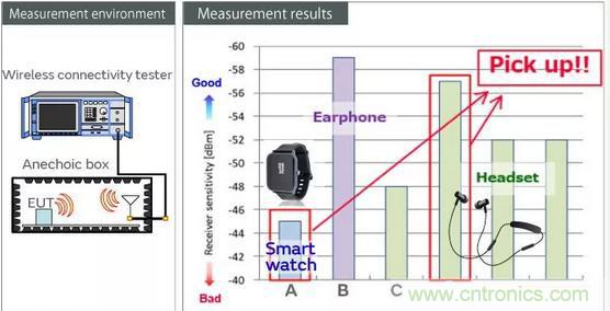 在許多內(nèi)部耳機(jī)干擾的情況下,設(shè)備內(nèi)的不需要的無線電波疊加在通信所需的信號之上,這會產(chǎn)生噪聲并導(dǎo)致音頻跳過。在這里,我們使用商業(yè)產(chǎn)品來測量2.4 GHz信號的最小接收電平,以驗(yàn)證由于設(shè)計(jì)對策而導(dǎo)致音頻跳過的可能性的差異,以防止藍(lán)牙設(shè)備內(nèi)的干擾。就內(nèi)部設(shè)備干擾而言,大圖值表示即使信號較弱也可以進(jìn)行通信,并且音頻不太可能跳過。