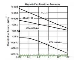 下圖比較了ADI的ADuM1100(磁隔離)和TI 的ISO72x(電容式隔離)的磁場(chǎng)抗擾度,雖然兩個(gè)例子在限定磁場(chǎng)下都不太受磁場(chǎng)影響,但I(xiàn)SO72x對(duì)磁場(chǎng)抗擾度有更好的表現(xiàn)。