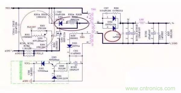 左邊綠色方框部分是驅(qū)動(dòng)電路,和之前LLC拓?fù)潋?qū)動(dòng)一樣,離MOS就近放置,原理圖上就體現(xiàn)出來。