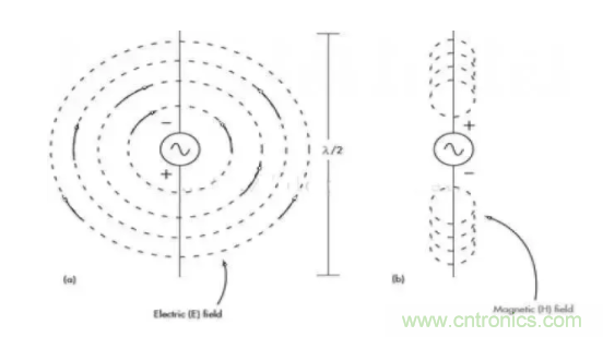 圖1展示了典型的半波偶極子天線是如何產(chǎn)生電場(chǎng)和磁場(chǎng)的。轉(zhuǎn)發(fā)后的信號(hào)被調(diào)制為正弦波,電壓呈極性變化,因此在天線的各元件間生成了電場(chǎng),極性每半個(gè)周期變換一次。天線元件的電流產(chǎn)生磁場(chǎng),方向每半個(gè)周期變換一次。電磁場(chǎng)互為直角正交。