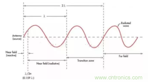 對(duì)近場(chǎng)似乎還沒有正式的定義,它取決于應(yīng)用本身和天線。通常,近場(chǎng)是指從天線開始到1個(gè)波長(zhǎng)(λ)的距離。波長(zhǎng)單位為米,公式如下: