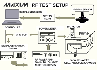 Maxim的RF測試裝置(圖2)產(chǎn)生用于測試RF抗干擾能力的RF場。測試電波暗室具有一個屏蔽室,作用與法拉第腔的屏蔽室類似,具有連接電源和輸出監(jiān)視器的端口。把下面列舉的設(shè)備連接起來就可以組成測試裝置:
