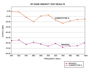 兩個雙運放(MAX4232和競爭產(chǎn)品X)的測試結(jié)果如圖3所示,測量值為平均輸出dBV。RF頻率在800MHz至1GHz范圍內(nèi)變化時,在均勻的60V/m電場中,MAX4232的平均輸出大約為-66dBV (500µVRMS相對于1V);競爭產(chǎn)品X的平均輸出大約為-18dBV (125mVRMS,相對于1V)。沒有RF信號時,電壓表的讀數(shù)為-86dBV。