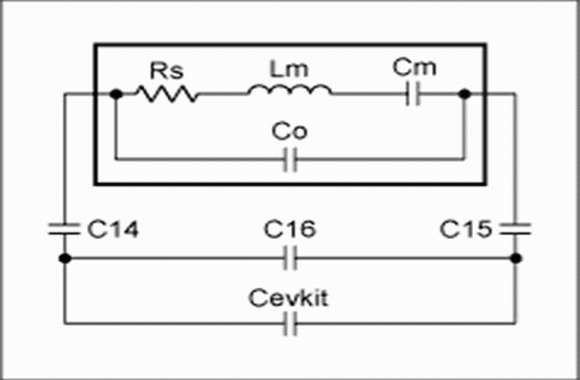 圖3給出MAX1470評(píng)估板電路里的晶體圖。在這個(gè)電路中,C14和C15是串聯(lián)牽引電容,而C16是并聯(lián)牽引電容。Cevkit為等效的MAX1470芯片加上評(píng)估PCB的寄生電容。Cevkit約為5pF。