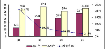 賽迪顧問數(shù)據(jù)顯示,2007年中國PND市場一路飆升,2008年仍保持了平穩(wěn)快速增長,前三季度市場銷售量達(dá)到117.2萬臺,同比增長率為85.5%。盡管宏觀經(jīng)濟(jì)環(huán)境低迷,進(jìn)入第四季度PND傳統(tǒng)旺季,PND市場仍表現(xiàn)優(yōu)異,銷量將超過第三季度實(shí)現(xiàn)環(huán)比增長。 圖1 2007~2008年中國PND市場銷售量對比