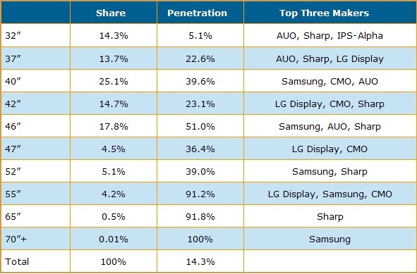 從尺寸別來看第一季雙倍頻液晶電視面板出貨結(jié)果,40寸是最主要的出貨尺寸,出貨量比重達(dá)25.1%,46寸以17.8%暫居第二,42寸以14.7%市占率排名第三。而采四倍頻技術(shù)液晶電視面板出貨則集中在40、46與52寸等較大尺寸面板。