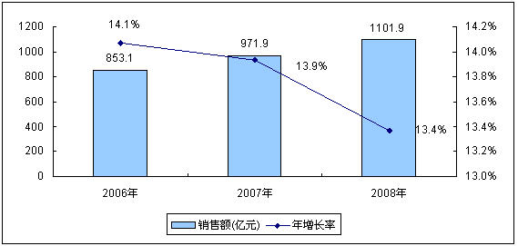 - 2008年銷售額達到1101.9億元,與2007年市場規(guī)模相比,增長13.4%