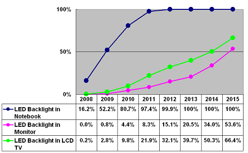同時(shí),2013年采用LED背光的大尺寸(指10寸及以上尺寸)面板出貨量將從2009年約8千490萬(wàn)片成長(zhǎng)到4億3千480萬(wàn)片,將占LED背光市占率估計(jì)為54.3%,LED背光將成為市場(chǎng)主流規(guī)格。其中notebook PC將是LED背光主要應(yīng)用,依據(jù)DisplaySearch分析到了2012年百分之百notebook PC都將采用LED背光。