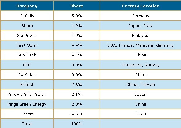 表一 2013年全球太陽能電池產(chǎn)能占有率