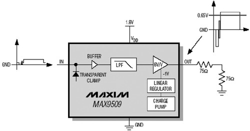 當視頻濾波放大器采用1.8V電源電壓工作時,必須采用DirectDrive技術(shù)。采用電壓模式輸出級的放大器必須至少提供2VP-P擺幅,才能輸出復合視頻信號。傳統(tǒng)的放大器采用1.8V單電源供電時,沒有足夠的余量產(chǎn)生2VP-P輸出信號。而采用DirectDrive后,集成反向電荷泵將產(chǎn)生一個嘈雜的-1.8V電壓;負電壓線性穩(wěn)壓器將-1.8V電壓穩(wěn)定到-1V,降低了電荷泵噪聲。因此,實際采用-1V~+1.8V的電壓供電時,MAX9509剛好有足夠的余量輸出2VP-P視頻信號。