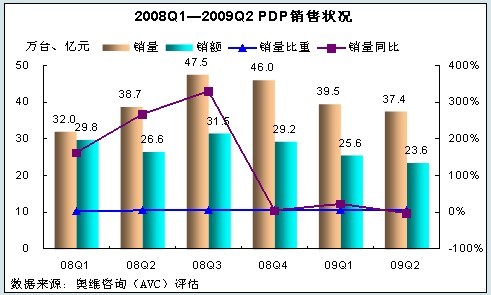 奧維咨詢(AVC)數(shù)據(jù)表明:2009年上半年等離子彩電國內(nèi)市場零售量規(guī)模為76.8萬臺、占整體彩電市場的5.1%,零售額規(guī)模為49.2億元,占整體彩電市場的9.1%,分別較去年同期相比變化8.8%、-12.8%。