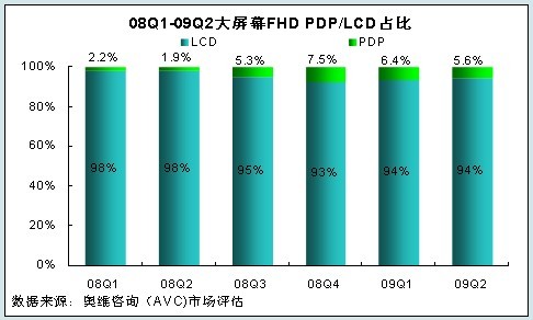 大屏幕等離子產(chǎn)品銷量的增加、全高清技術(shù)滲透率的提升,以及大屏幕全高清等離子產(chǎn)品價格的持續(xù)走低等助推了等離子在40英寸以上大屏幕FHD市場占有率由2008年上半年的2.0%,上升至2009年上半年的6.0%,同比增加4.0%。競爭力持續(xù)增強的趨勢已經(jīng)顯現(xiàn)。