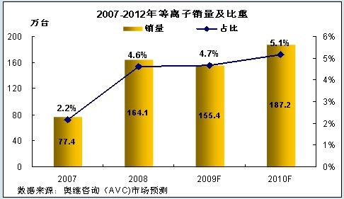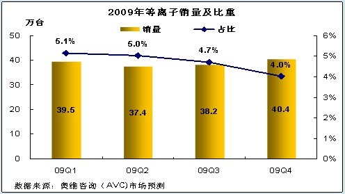 考慮到未來平板電視市場的走勢、結(jié)合等離子上下游產(chǎn)業(yè)情況,奧維咨詢(AVC)預測:2009年全年等離子銷量為155.4萬臺,與2008年的總量基本持平。2009年下半年,受液晶市場的規(guī)模優(yōu)勢擠壓,第三、四季度等離子電視的銷量因彩電旺季到來將上升至78.6萬臺,但占市場比重將下降至4.3%。