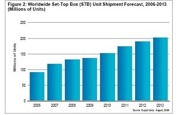2008年第四季度,當(dāng)全球經(jīng)濟(jì)陷入衰退的時(shí)候,領(lǐng)先STB廠商報(bào)告說銷售大增。這種局面保持到了2009年,雖然第一季度STB出貨量低于2008年第四季度,但仍高于2008年第一季度,這對(duì)于目前疲軟的電子市場(chǎng)中的任何一種產(chǎn)品來說,都是難能可貴的表現(xiàn)。