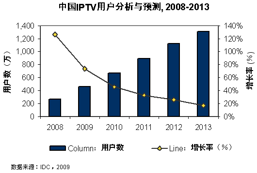 - IDC預計,2009年中國IPTV用戶將達到460萬,同比增長73.6%