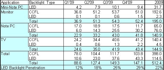 - 2009年第三季大尺寸 LED背光源面板出貨將達3千760萬片,占所有大尺寸液晶面板的25%