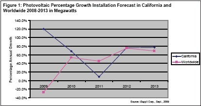 圖1所示為iSuppli公司對(duì)于2009至2013年加州以及全世界光伏系統(tǒng)安裝增長(zhǎng)情況的預(yù)測(cè)。