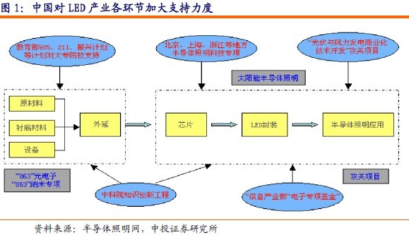 從2005年開始科技部批準(zhǔn)了大連、廈門、上海、南昌、深圳等五個(gè)半導(dǎo)體照明產(chǎn)業(yè)基地,之后在2007年和2008年相繼批準(zhǔn)石家莊、揚(yáng)州等兩個(gè)半導(dǎo)體照明產(chǎn)業(yè)基地,在政策、稅收和資金上給予長(zhǎng)期支持。