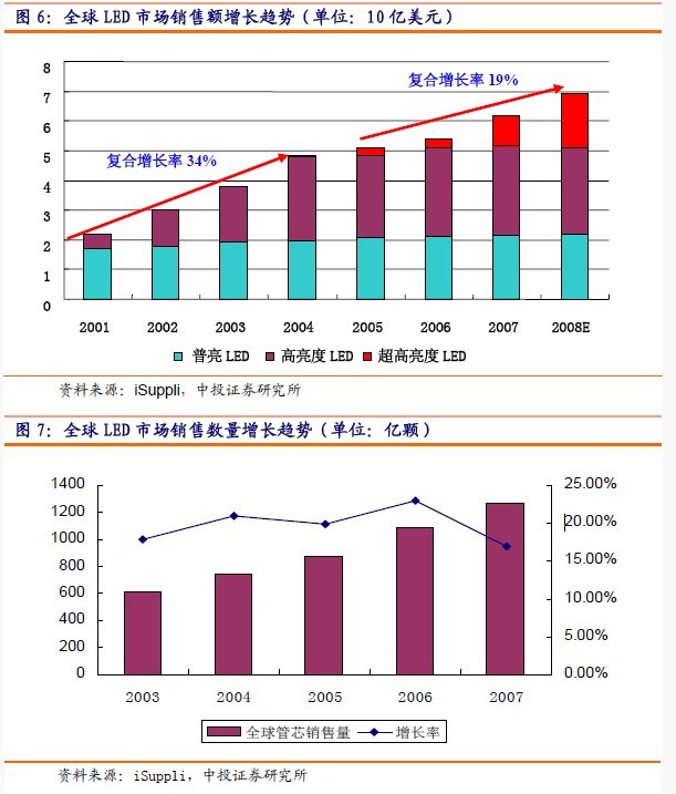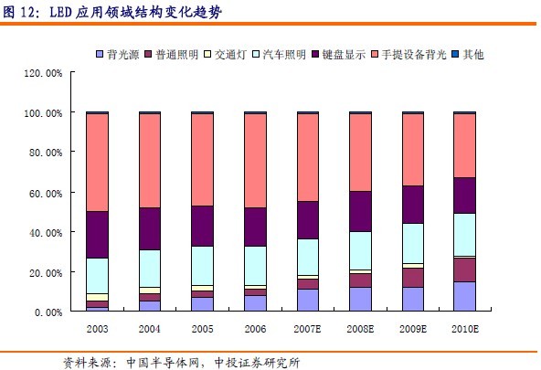新興應(yīng)用市場(chǎng)如通用照明、汽車前燈、大屏幕LCD背光源等將成為高亮度LED市場(chǎng)增長(zhǎng)的新動(dòng)力,在大屏幕LCD背光源的推動(dòng)下,2008年LCD背光源仍將占有26%的市場(chǎng)份額,到2008年高亮度LED市場(chǎng)仍將增長(zhǎng)一倍。2008年LED市場(chǎng)總銷售額將達(dá)到69億美元。