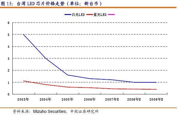 2004年臺(tái)灣廠商生產(chǎn)的藍(lán)光LED價(jià)格跌幅達(dá)到30%,2004年底藍(lán)光LED報(bào)價(jià)已跌至新臺(tái)幣0.60-0.80元,05年藍(lán)光LED的價(jià)格跌勢(shì)趨緩,全年跌幅在15%。預(yù)計(jì)08年全年跌幅在10%左右。
