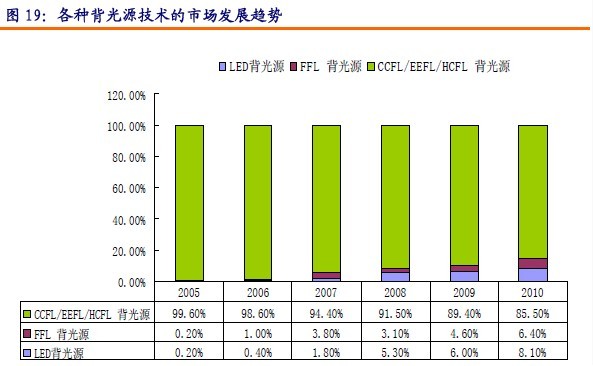 可以看出,從2006年到2008LED背光源的快速成長(zhǎng)期。如果按照2010年TFT-LCD市場(chǎng)銷售額950億美元,背光模組占其中20%計(jì)算,屆時(shí)背光模組的份額約為190億美元。據(jù)此推算,LED背光模組份額為15.39億美元,這是比較保守的估計(jì)。