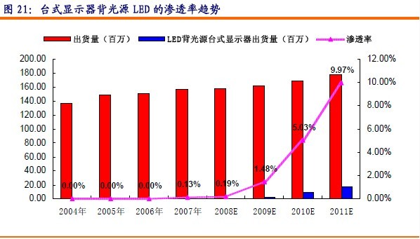 預(yù)計(jì)臺(tái)式顯示器的出貨量將從2007年的156.6百萬臺(tái)增長(zhǎng)到2011年的177.5百萬臺(tái),其中采用LED背光源的臺(tái)式顯示器將從2007年的0.2百萬臺(tái)增長(zhǎng)到2011年的17.7百萬臺(tái)左右,滲透率從2007年的0.1%上升到2011年的10%左右。其中每臺(tái)顯示器用lLED數(shù)量為60個(gè)左右。