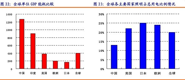 中國(guó)政府也已經(jīng)開始實(shí)現(xiàn)照明節(jié)能計(jì)劃,目標(biāo)是到2010年每年降低能耗10%。在目前的照明用電占整個(gè)用電的比例中,可以看出中國(guó)照明用電比例低于全球主要經(jīng)濟(jì)發(fā)達(dá)國(guó)家,也低于全球的平均水平,說明工業(yè)用電比例較高,從而使得單位GDP所消耗的能源明顯高于全球平均水平。