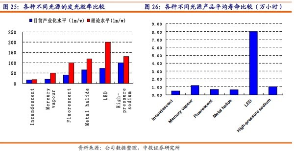 LED燈相對(duì)于其他光源有壽命長(zhǎng)、發(fā)光效率提高空間大的優(yōu)勢(shì),并且LED燈由于采用物理P-N結(jié)的冷發(fā)光原理,使得LED燈轉(zhuǎn)化效率高,也不存在汞燈污染源,被譽(yù)為綠色環(huán)保的照明能源并不為過。LED燈最高發(fā)光率為200流明/瓦,遠(yuǎn)高于其他的光源產(chǎn)品;其壽命理論值達(dá)到10萬小時(shí),遠(yuǎn)遠(yuǎn)高于其他光源產(chǎn)品。