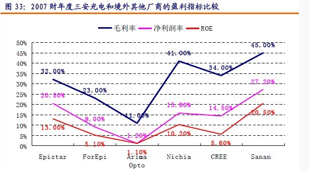 從盈利指標(biāo)來看,2007年度三安光電的銷售毛利率達(dá)到45%,凈利潤(rùn)率達(dá)到27.2%,REO為20.50%,遠(yuǎn)高于其他國(guó)際大廠的盈利指標(biāo)。其中可能的原因分析來看,國(guó)內(nèi)MOCVD設(shè)備折舊年限、國(guó)內(nèi)制造費(fèi)用先對(duì)較低、臺(tái)灣廠商進(jìn)入2008年實(shí)行股權(quán)、股票、分紅等激勵(lì)措施的原因造成國(guó)內(nèi)上游LED廠商的盈利能力平均高于國(guó)外廠商。