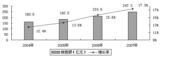 圖一:2004~2007我國(guó)醫(yī)療電子市場(chǎng)規(guī)模和增長(zhǎng)率