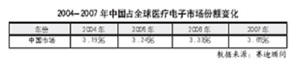 圖二:2004~2007年我國(guó)占全球醫(yī)療電子市場(chǎng)份額的變化