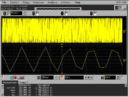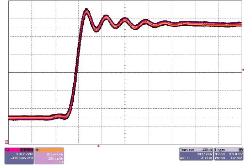 簡單地設(shè)置示波器,重復(fù)觸發(fā)波形,建立波形的余輝地圖,保證波形是重復(fù)的。在這一步時一定要關(guān)閉內(nèi)插。如果波形是重復(fù)的,它將建立一張很緊的余輝地圖。然后,在確定了重復(fù)性之后,您需要高效的采樣率,作為參考給出波形。大多數(shù)高端DSO提供了一種等效時間模式(力科示波器上稱為RIS),可以使用這種模式采集參考曲線。力科DSO還提供了一種處理函數(shù),稱為余輝曲線中間值,它從余輝地圖中提取中間波形。保存參考波形,以備以后比較。如果不能確定怎樣保存參考波形,可以打印余輝視圖,以進行比較。