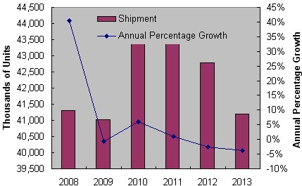- 在未來四年內,全球銷售量預計將保持平穩(wěn),2013年預計為4,120萬個,幾乎與2008年持平