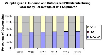 iSuppli公司對2008-2013年內部和外包PND制造業(yè)務的預測。