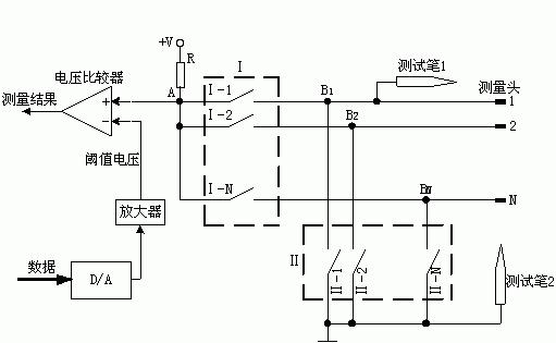 實(shí)現(xiàn)自動(dòng)測(cè)量的前提是將被測(cè)元件引腳連入探測(cè)電路中,為此探測(cè)設(shè)備設(shè)置若干個(gè)測(cè)量頭,通過電纜引出,測(cè)量頭可掛接各種測(cè)試夾具與元件引腳建立連接,測(cè)量頭的數(shù)量決定了同一批連入探測(cè)電路的引腳數(shù)。然后在程序控制下探測(cè)儀按組合原則依次將被測(cè)"引腳對(duì)"一一納入測(cè)量通路。在測(cè)量通路中將"引腳對(duì)"之間的通/斷路狀況呈現(xiàn)為引腳間有無電阻,測(cè)量通路將其轉(zhuǎn)換為一個(gè)電壓量,由此判斷它們之間的通/斷路關(guān)系并加以記錄。