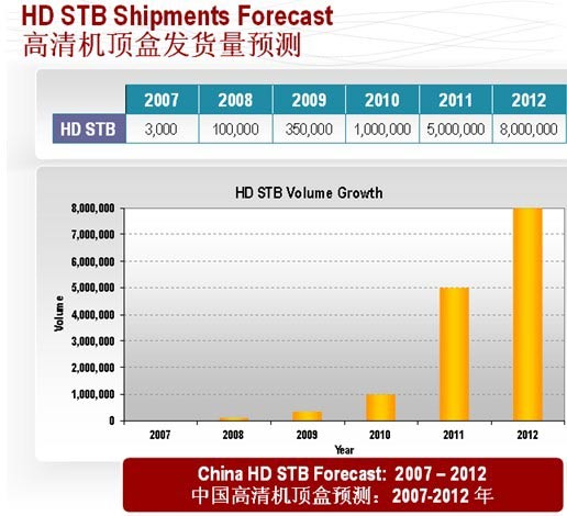 此外,博通特別對高清機頂盒市場做了分析。寬帶通訊事業(yè)部資深市場總監(jiān)JohnGleiter說,由于政府大力推進(jìn)高清內(nèi)容進(jìn)入消費者市場,預(yù)示著中國的高清機頂盒產(chǎn)業(yè)正式破冰啟航。與此同時,廣電總局要求的九套免費高標(biāo)清同播的衛(wèi)視節(jié)目將從現(xiàn)在開始不斷完善。在總局內(nèi)容高清化的時間表中,到2010年,這五套衛(wèi)視的所有節(jié)目都需實現(xiàn)高、標(biāo)清同播,這就打開了之前制約高清電視發(fā)展的內(nèi)容瓶頸。而高清平板電視機的普及更為高清大發(fā)展迎來了契機。目前70%的平板電視機是高清或全高清兼容的,這就意味著購買高清電視機的消費者將成為運營商挖掘的潛在用戶。單一的數(shù)字化整轉(zhuǎn)運營商需要大量的成本投入,現(xiàn)在很多運營商將未來的盈利模式都鎖定在高清和互動兩個方面,所以未來可能有更多的運營商考慮“高清轉(zhuǎn)換”,這就帶來了有線高清機頂盒將在2010年大幅增長的趨勢。In-Stat預(yù)測,到2010年末將交付50萬臺先進(jìn)的有線電視機頂盒,這些機頂盒都將具有高清處理能力。