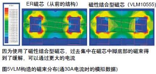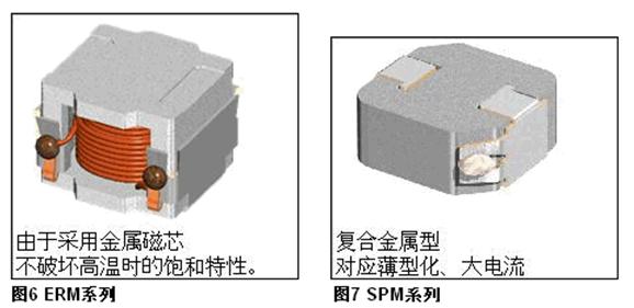 一直以來,一般的電感是以Ni-Zn系的鐵氧體作為磁芯的,這種材料雖然強度較高,但是飽和磁束密度較低,高溫時,飽和磁束密度會降低,在電子部件驅(qū)動日趨低電壓,大電流化的今日,這類小型化產(chǎn)品無法對應(yīng)大電流。要在高溫環(huán)境下通過更大的電流,就要使用由飽和磁束密度高且損耗小的Mn-Zn鐵氧體磁芯構(gòu)成的電感。一般而言,Mn-Zn鐵氧體材料的電感,磁芯的中腳部分會形成Gap,磁芯的中腳部分開始較容易飽和。如圖4 VLM所示,結(jié)構(gòu)是由口字形磁芯(磁性結(jié)合型磁芯)和棒狀磁芯組成。采用了這種構(gòu)造后,將本來容易產(chǎn)生飽和的中心磁芯的中腳部分分成上下兩部分,在上下根部形成Gap,不易出現(xiàn)部分飽和,能夠容許更大電流通過。另外,由于Gap分散在卷線的上下兩端,可以減少從Gap泄漏的磁束對卷線的影響。過電流損失減少,電源效率也提高了。再者,還可使用金屬磁芯的電感。它的飽和磁束密度更高,受溫度影響飽和電流的變化很少。如圖6 ERM6050所示。金屬磁芯的電感還有另外一款復(fù)合金屬型的電感(圖7 SPM系列)。