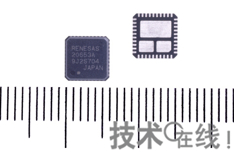 R2J20653ANP將高端(High Side)MOSFET、低端(Low Side)MOSFET以及驅(qū)動這兩種MOSFET的驅(qū)動IC集成在了一個封裝內(nèi)。均為瑞薩制造。低端MOSFET內(nèi)置有肖特基勢壘二極管(Schottky Barrier Diode),降低了開關(guān)時的損耗。另外,將驅(qū)動IC面向兩個MOSFET的開關(guān)控制進(jìn)行了優(yōu)化。由此,在輸入電壓為20V、輸出電壓為1.1V(頻率為300kHz)的條件下,實現(xiàn)了91%的電力轉(zhuǎn)換效率。