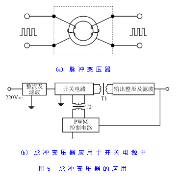 脈沖變壓器的匝數(shù)較少,而且一次繞組和二次繞組分別繞于鐵氧體磁芯的兩側(cè),這種工藝使得它的分布電容特小,僅為幾個pF,所以可作為脈沖信號的隔離元件。脈沖變壓器傳遞輸入、輸出脈沖信號時,不傳遞直流分量,因而在微電子技術(shù)控制系統(tǒng)中得到了廣泛的應(yīng)用。一般地說,脈沖變壓器的信號傳遞頻率在1kHz~1MHz之間,新型的高頻脈沖變壓器的傳遞頻率可達(dá)到10MHz。圖5(a)是脈沖變壓器的示意圖。脈沖變壓器主要用于晶閘管(SCR)、大功率晶體管(CTR)、IGBT等可控器件的控制隔離中。圖5(b)是脈沖變壓器的應(yīng)用實例。
