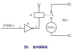 繼電器是常用的數(shù)字輸出隔離元件,用繼電器作為隔離元件簡單實用,價格低廉。圖6是繼電器輸出隔離的實例示意圖。在該電路中,通過繼電器把低壓直流與高壓交流隔離開來,使高壓交流側(cè)的干擾無法進(jìn)入低壓直流側(cè)。