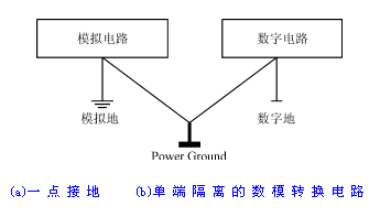 一般地說,模擬電路與數(shù)字電路之間的轉(zhuǎn)換通過模數(shù)轉(zhuǎn)換器(A/D)或數(shù)模轉(zhuǎn)換器(D/A)來實現(xiàn)。但是,若不采取一定的措施,數(shù)字電路中的高頻振蕩信號就會對模擬電路帶來一定的干擾,影響測量的精度。為了抑制數(shù)字電路對模擬電路帶來的高頻干擾,一般須將模擬地與數(shù)字地分開布線,參見圖7(a)。這種布線方式不能徹底排除來自數(shù)字電路的高頻干擾,要想排除來自數(shù)字電路的高頻干擾,必須把數(shù)字電路與模擬電路隔離開來,常用的隔離方法是在A/D轉(zhuǎn)換器與數(shù)字電路之間加入光電耦合器,把數(shù)字電路與模擬電路隔離開,參見圖7(b)。但這種電路還不能從根本上解決模擬電路中的干擾問題,仍然存在著一定的缺陷,這是因為信號電路中的共模干擾和差模干擾沒有得到有效的抑制,對于高精密測量的場合,還不能滿足要求。對于具有嚴(yán)重干擾的測量場合,可采用圖7(c)所示的電路。在該電路中,把信號接收部分與模擬處理部分也進(jìn)行了隔離,因為在前置處理級與模數(shù)轉(zhuǎn)換器(A/D)之間加入線性隔離放大器,把信號地與模擬地隔開,同時在模數(shù)轉(zhuǎn)換器(A/D)與數(shù)字電路之間采用光電耦合器隔離,把模擬地與數(shù)字地隔開,這樣一來,既防止了數(shù)字系統(tǒng)的高頻干擾進(jìn)入模擬部分,又阻斷了來自前置電路部分的共模干擾和差模干擾。當(dāng)然,這種系統(tǒng)的造價較高,一般只用于高精度的測量系統(tǒng)中。