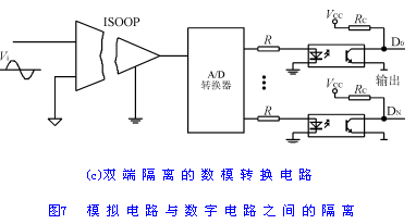 模擬電路與數(shù)字電路之間的隔離主要采用模/數(shù)轉(zhuǎn)換裝置;對于要求較高的電路,除采用模/數(shù)轉(zhuǎn)換裝置外,還應(yīng)在模/數(shù)轉(zhuǎn)換裝置的兩端分別加入模擬隔離元器件和數(shù)字隔離元器件。