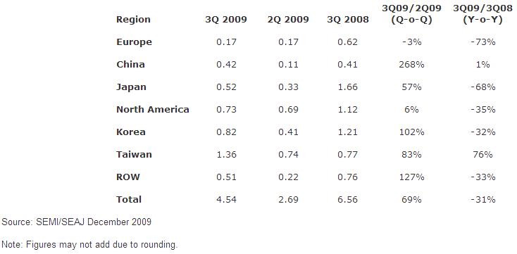 - 2009年第三季度全球半導(dǎo)體制造設(shè)備出貨額達(dá)到45.4億美元