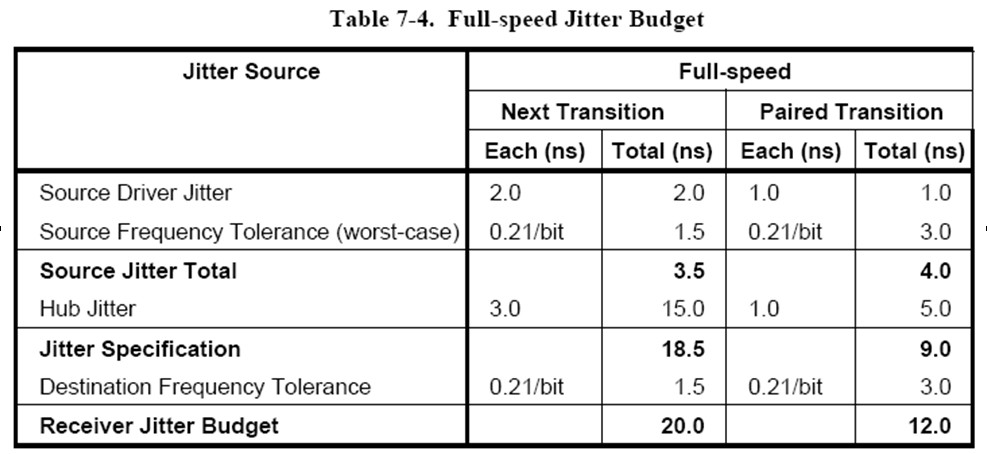 USB2.0是一種復(fù)雜的總線結(jié)構(gòu),既包括高速、全速、低速三種速率級(jí)別,也包括主機(jī)、設(shè)備、集線器三類產(chǎn)品,每種類別又包括多個(gè)參數(shù)需要測(cè)試,幅度、抖動(dòng)、時(shí)序、過程等特性都需要一一分析是否滿足規(guī)范要求。USB2.0一致性測(cè)試規(guī)范對(duì)HighSpeed的Device分析就定義了幾十個(gè)參數(shù)。每一種參數(shù)的測(cè)量對(duì)于示波器的使用都定義了設(shè)置參數(shù),如下1就是USB-IF對(duì)全速抖動(dòng)測(cè)試的容限范圍規(guī)定: